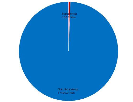 That means that 0.05% of the men she encountered (0.025% of the humans she encountered) were perceived by her to be sexually harassing her. That means that out of every 175 people she encountered, one was creepy or talked to her. I know some of you are visually oriented, so here’s a graph to display her experience.